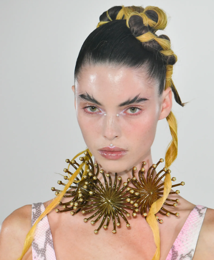 Brows are destined to peak in the next 12 months. Eclectic arches were models’ best accessories on the spring 2023 runways with stylized slits at Poster Girl, pencil-thin arches at Vivienne Westwood, geometric, metallic triangles at Thom Browne, bleached brows at Givenchy and Roberto Cavalli, and piercings at Off-White. Hernandez predicts even ultra-thin, heavily-plucked brows will be back. (We do not approve but are here to report the news.)